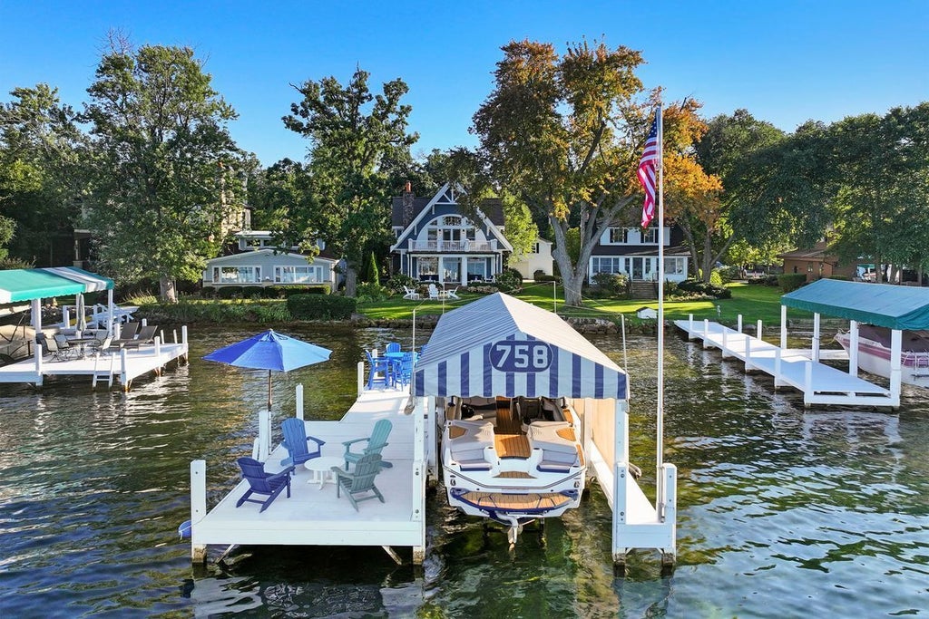 This timeless lakefront home on Geneva Lake's south shore offers level frontage, a private pier with canopied slip and sitting area. Open floor plan features a Great Room with stone fireplace, lake views, screened patio, and manicured yard. Five bedrooms and five full baths, including a main-level suite and an upstairs primary with lakeside deck. Sold fully furnished and turn-key. Large, heated garage and extra parking. Built by Engerman, this home has coffered ceilings, crown molding, built-ins, and wide-plank pine floors, pairing architectural detail with modern comfort. New Generac whole house generator. Lake Geneva Beach Association includes sandy beach, swim piers, diving boards, lake slide, playground, and picnic area. Just minutes from downtown yet tucked away with stunning sunsets